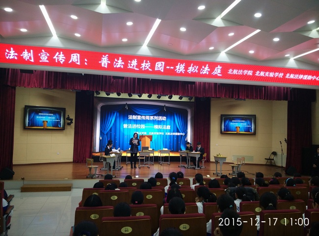 2015年12月17日上午,北航法学院及北航法律援助中心的大学生为我校初二年级全体学生举办了普法进校园——模拟法庭活动,此次活动也是我校大中联动系列活动之一。