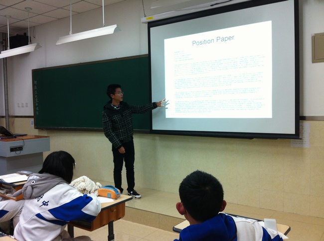 2015年12月3日下午,北航实验学校中学部模拟联合国社团邀请北京师范大学模拟联合国协会学术部的何尧、李童、程康笛三位学长走进课堂,对社团成员进行学术培训。