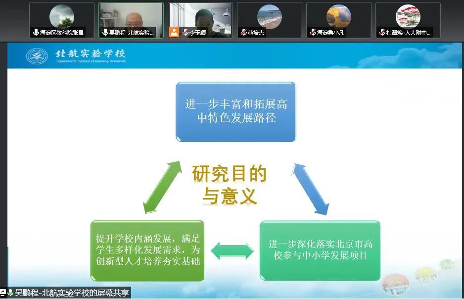 2022年10月20日上午,在海淀区教育科学研究院的组织下,课题负责人吴鹏程校长及该课题核心组成员共同参加了“区属北京市教育科学规划2022年度一般课题集中开题论证会”。吴校长的课题《大学中学联动背景下高中特色发展案例研究》在“五育并举”时代背景下,在原有课题研究的基础上,基于学校自身发展的体制和办学优势,聚焦大学中学联动下高中特色发展研究,探索建立有效灵活的大学资源支持机制,在课程建设方面,在科技、艺术、体育、劳动教育等领域深化实践,及时总结梳理形成科技、艺术、体育、劳动教育等特色项目的发展典型案例,优化完善课程体系,丰富特色/学科课程群,产生辐射作用,为同类研究提供借鉴。