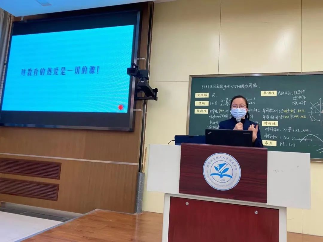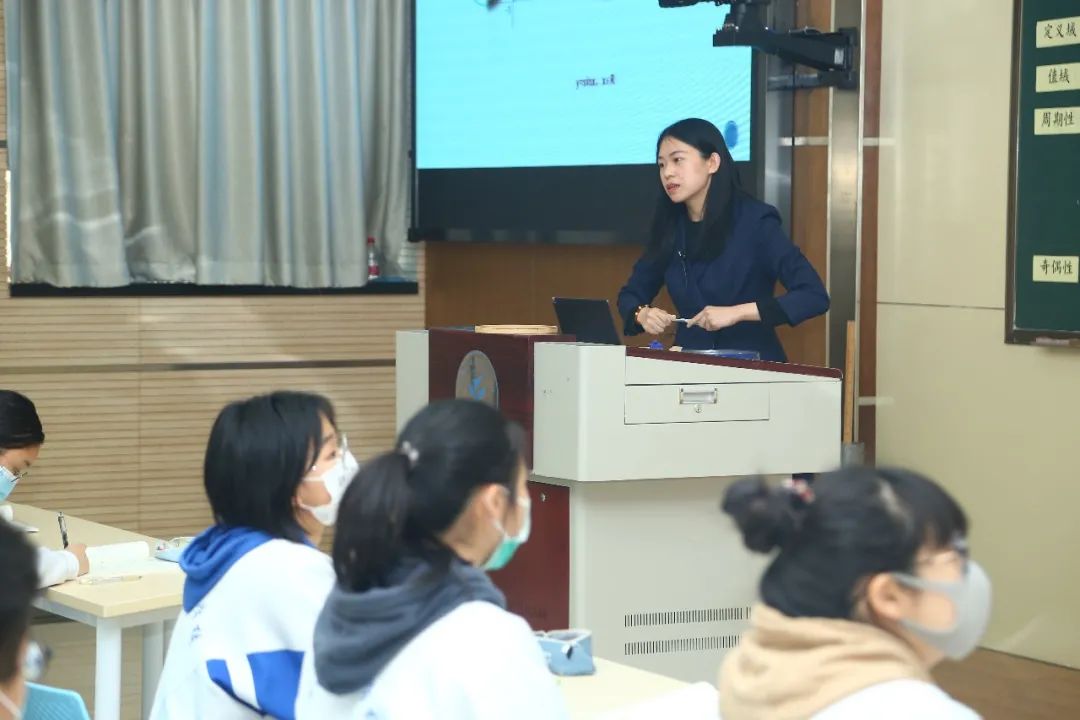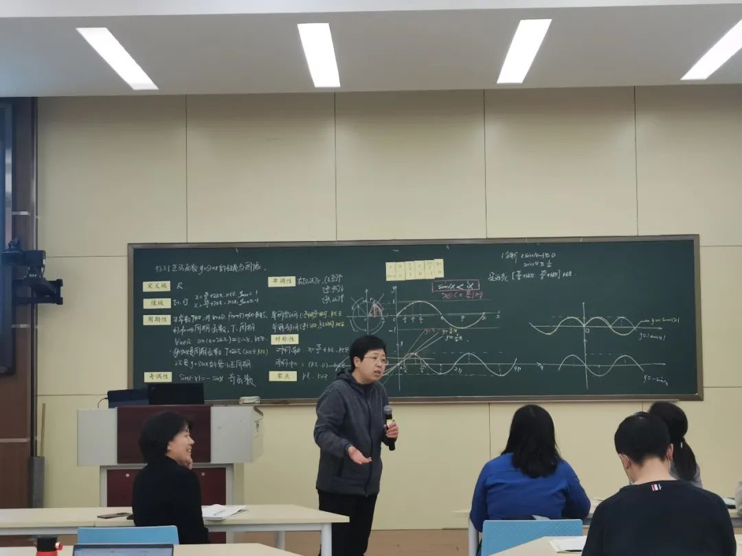 李艳红老师为新任教师们作示范课程展示,呈现了“正弦函数的性质与图像的应用”。李艳红老师在授课过程中,深入浅出地对难度更高的应用层面内容进行了讲授,尤其在思维引导、难点解析等多方面进行了深刻的剖析,展现了三十余年深厚的教学专业基本功。