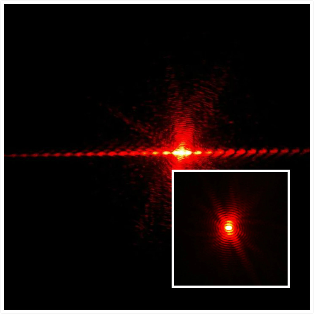 3.将针(狭缝)固定在台钳上,打开激光笔,调整激光笔高度及方向,使光斑照射在针孔中间部位,观察在墙上的成像,并记录图像。