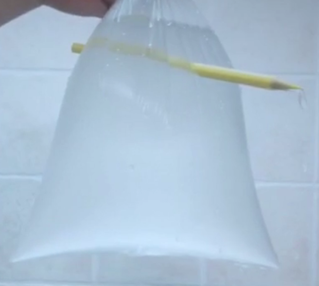 塑料是一种合成材料,许多这样的合成材料,即使在非常固定的状态下也具备柔韧性。有的甚至可以自行发生变化,保鲜袋的用料属于所谓的热塑型塑料,这种材质在特定的温度范围内易于塑形,当签子刺破保鲜袋时,这种具有弹性的塑料会将它紧紧包住,也就是说,塑料颗粒围住了签子,所以保鲜袋依然是不透水的。热塑型塑料由长长的颗粒链条组成,通过高温,人们可以把它塑造成任意形状。塑形的过程是可逆的,也就是说是可以颠倒的。