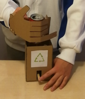 拉动机械手的操纵线会做出和手同样的动作,按动底下的雪糕棒,垃圾桶盖会自动打开。