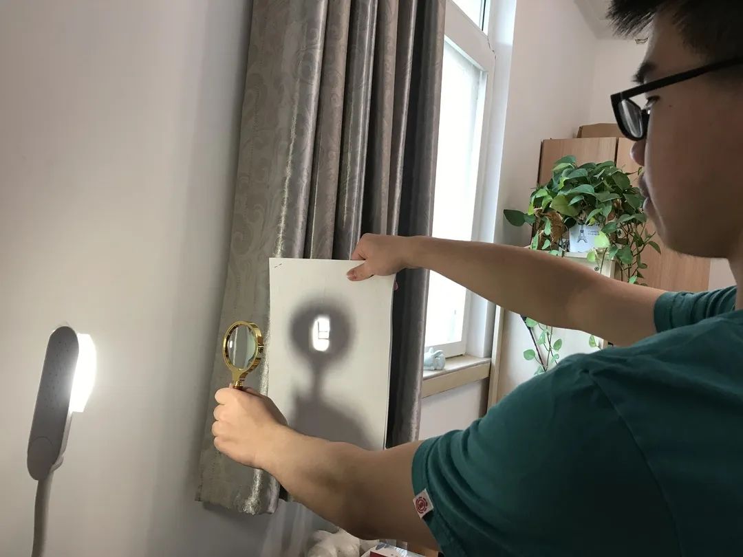 2.将带孔锡箔纸固定在台钳上,打开激光笔,调整激光笔高度及方向,使光斑照射在小孔上,观察在墙上的成像,并记录图像。
