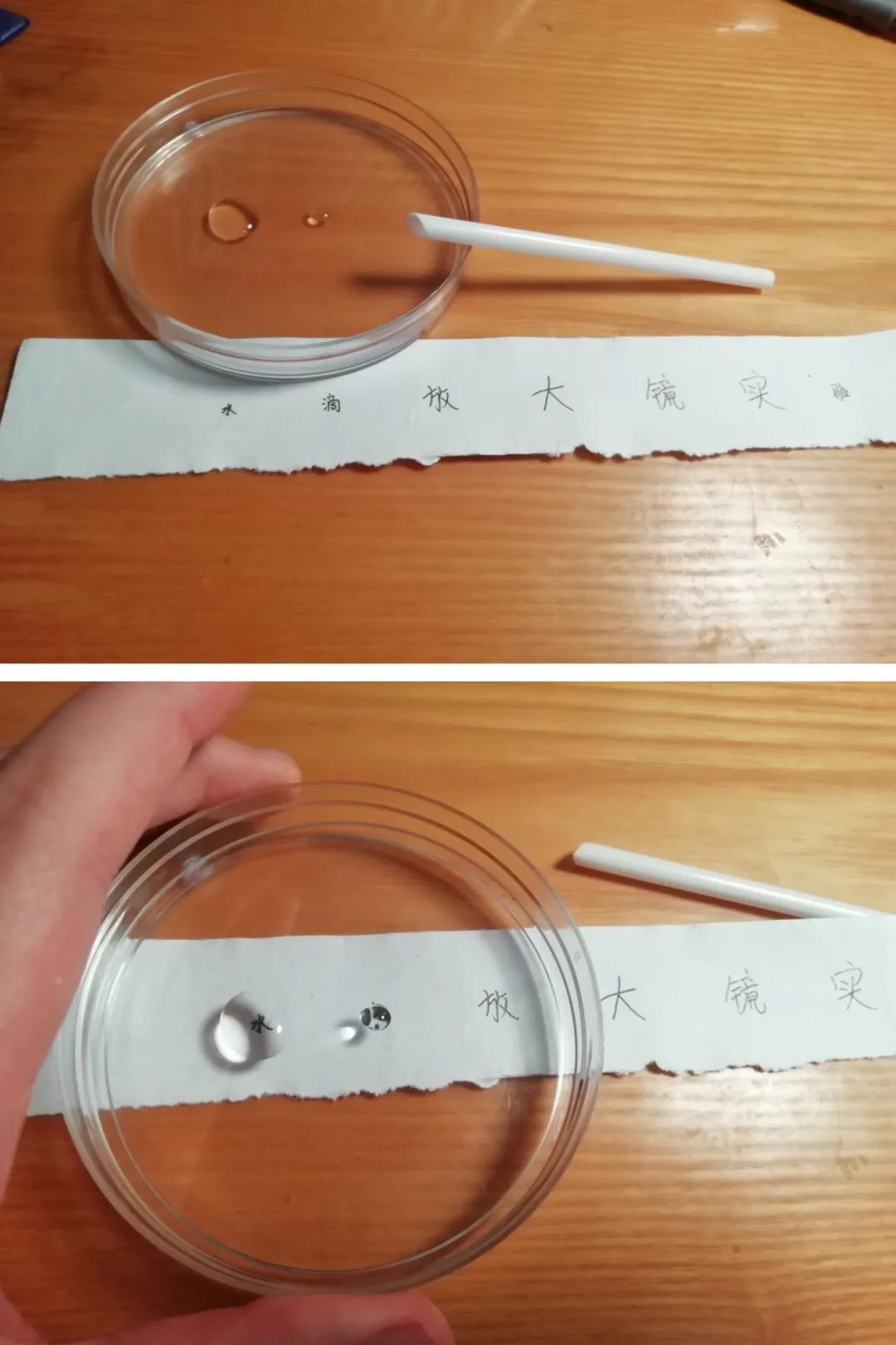 本实验运用了凸透镜成像的原理。水滴之所以能够放大或缩小字样是因为水珠相当于一个凸透镜,对光线有会聚作用。水滴放大镜重点运用了凸透镜成像特点中物距小于焦距的情况,当物距小于焦距,成正立放大的虚像,此时物距越接近焦距,成像越大。但当我们将放大镜拿的过远时,成像特点就会发生变化,由物距小于焦距逐渐到物距大于两倍焦距,成像由正立放大的虚像逐渐到倒立缩小的实像。