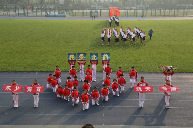 朵朵白云衬托湛蓝秋空,在杨主任铿锵有力的口令下,校鲜花队、红旗队、彩旗队、教师代表队,以及33个学生代表队,伴着激昂的《运动员进行曲》,踩着整齐有力的步伐,喊着响彻云霄的口号,依次向主席台走来,向全体师生展现他们的青春与活力,激情与创意,呐喊声、欢呼声沸腾在赛场的上空,幸福与欢乐洋溢在每一个人的脸上。“通识、立志、明理、成才”此刻汇聚成一股股暖流融化在每一个人的血液里。各代表队匠心独运的入场设计充分彰显我校航空航天科技特色,充分表达对祖国、对学校无限的热爱。