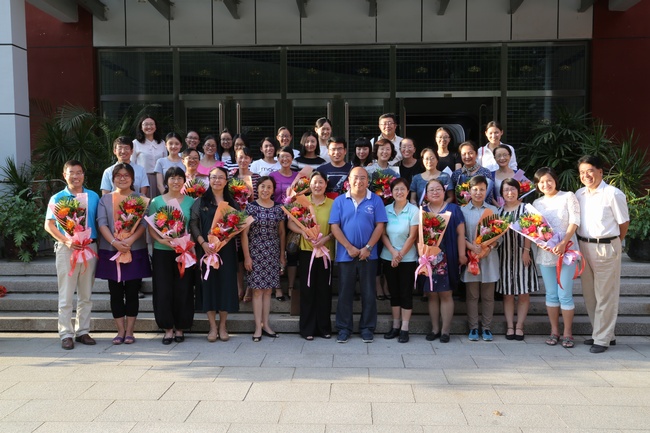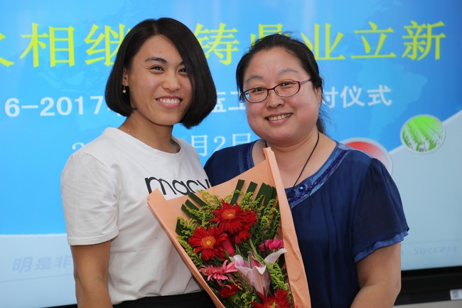 首先,教学校长许杰宣读了我校2016—2017学年校务委员会关于“青蓝工程拜师结对”的决议。许校长说,根据学校发展的实际需要,今年共安排了11对教学师徒、5对德育师徒、5对跟岗实践师徒,这在我校青蓝工程史上是规模最大、规格最高的一次。希望青年教师能珍惜机遇,以恭敬之心、谦卑之心刻苦学艺,促进自己尽快成长、成熟。接着吴鹏程校长、许杰副校长、汤主任分别为教学、德育师傅颁发聘书,聘期为一年。随后是指导教师代表和青年教师代表发言。师傅代表谢珊珊老师、孙英老师分别谈了自己曾经为徒的幸福经历,也谈及今日为师的忐忑和责任,谦逊中浸润真诚,言谈中蕴藏魅力,幸福满溢也责任满怀。胡泽军、张梦然两位老师代表青年教师发表了激情洋溢的发言,字里行间饱含对学校的谢意,对师傅的敬意。在场师徒的即兴感言将整个仪式推向一个小高潮,会场顿时充满温馨和感动。接下来,吴鹏程校长就师徒的发言进行了总结。吴校长坦言,北航实验学校的千秋伟业需要一代一代人去接力,他为北航实验学校拥有这些朝气蓬勃、活力四射的教坛新秀和德才兼备、满腹经纶的优秀教师而自豪。他真诚希望所有青年教师能将老教师传授的思想、方法,内化吸收并形成自己的风格,希望北航实验学校薪火相传的同时,能群芳吐艳、异彩纷呈、各具特色。仪式最隆重的环节是每一位青年教师给师傅们献鲜花、行拜师礼,场面真切而感人,气氛热烈而和谐。随着全体与会领导、青蓝师徒的合影留念,2016-2017学年的青蓝工程拜师会圆满落幕。