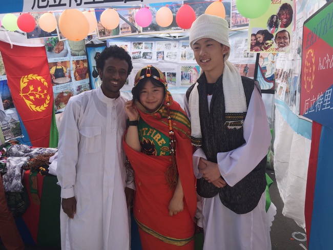 活动内容很丰富多彩。同学们在此可以了解到平日里很少接触的各国文化。各国留学生支起摊位,展示自己国家的服饰,分享本国美食。国际文化节活动在一场热闹的各国时装秀的暖场下开始了。高一的同学们兴奋地试穿异国服饰;激动地与身着军装或当地特色服装的留学生交流、合影留念。同时,大家也不忘完成老师提前布置的任务,认真地用英语采访外国友人,仔细地记录细节,准备回校后向同学们展示汇报。