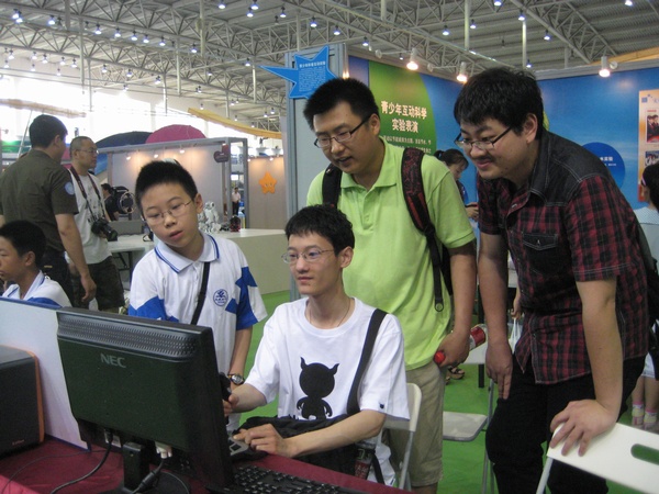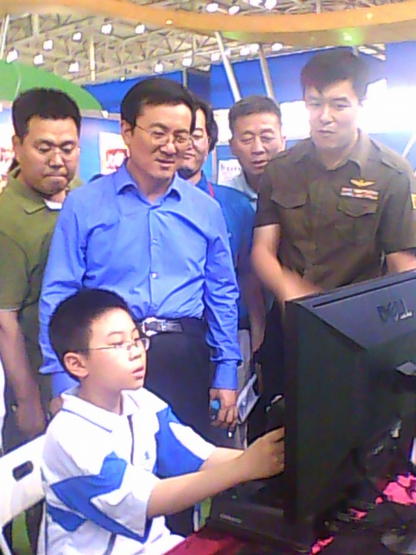 北航附中在科技文化乐园中精心布置了一个展位,展示富有航空特色的校本课程“模拟飞行”。在“模拟飞行”课上成绩优秀的吕博凡、王泽锴两位同学在展位前为感兴趣的参观者介绍和演示“模拟飞行”的操作方法。他们生动、形象的介绍和精彩的演示吸引了许多参观者也跃跃欲试,初次体验者总是很快就上演了“机毁人亡”的惨剧,但仍有许多参观者特别是中小学生们上机一试,展位前很快排起了长队。下午三点多钟,北京市科委朱世龙副主任来到北航附中展位前饶有兴致地观看了有关“模拟飞行”的展示,并在教练的指导下尝试了“模拟飞行”的全过程。