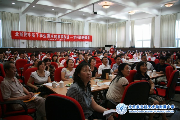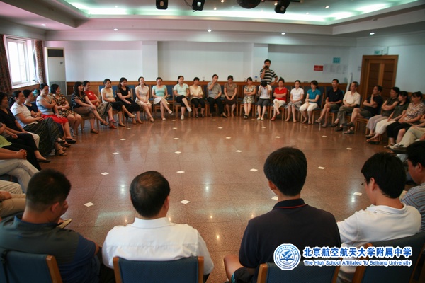 2009年7月20日—23日,北航附中举办了主题为“专心致志做教育 ,一心一意谋发展”的暑期全员培训。本次培训主要安排的内容有:于校长专题讲话;王曹送老师做了题为“思”的发言;全体教职工在北京交通大学学生心理素质教育中心的组织下,分组开展了丰富有趣的心理体验活动;分别邀请北京市教科院副院长张铁道博士和海淀区教师进修学校书记、常务副校长罗滨组织了主题为“北航附中基于学生需求的教学改进——学科跟进规划”的新课程校本研修活动;海淀区教师进修学校中教研副主任白雪老师做了题为“课堂教学有效性的一点思考”的报告;人大附中优秀班主任蔡真老师做了主题为“甘愿化作春雨 滋润满园春色”的班主任经验报告;北京市教育学院张红副教授做了“如何实施德育课程化”的报告;教学处组织开展了教师教学才能展示、选修课教学情况回顾与展望;德育处组织开展了德育论坛汇报交流活动。最后吴鹏程书记进行了本次全员培训的总结发言。