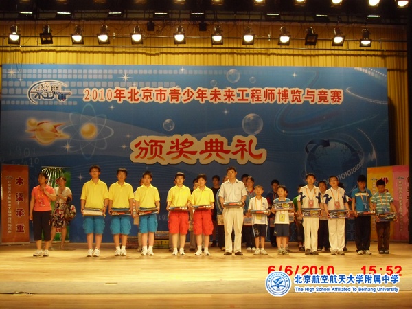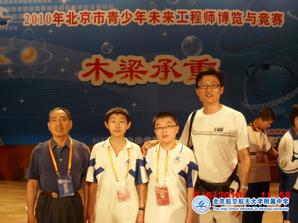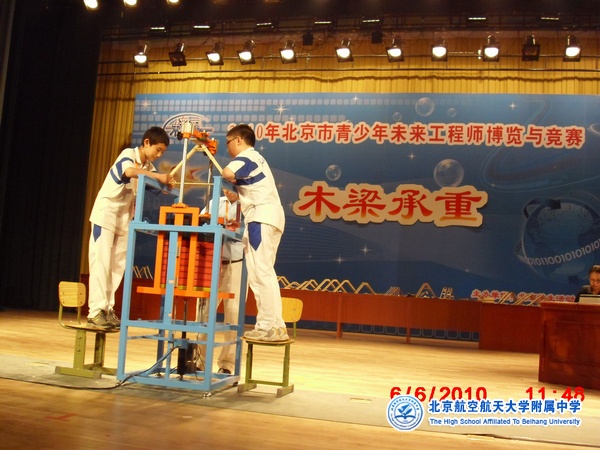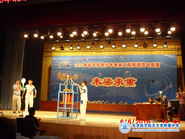 经过6月5日4个小时的紧张制作和6月6日近3个小时、38轮次的激烈测重较量,由我校初二3班王梓辰、肖俊彦、辅导教师范俊堂、领队都炜组成的代表队在35个代表队中脱颖而出,在《2010年北京市青少年未来工程师博览与竞赛》木梁承重项目中以承重316千克的优异成绩夺得第一名,并将代表北京市参加今年7月在中国科技馆举行的全国比赛。在此,我们向他们表示热烈祝贺并预祝他们在全国比赛中再创佳绩。