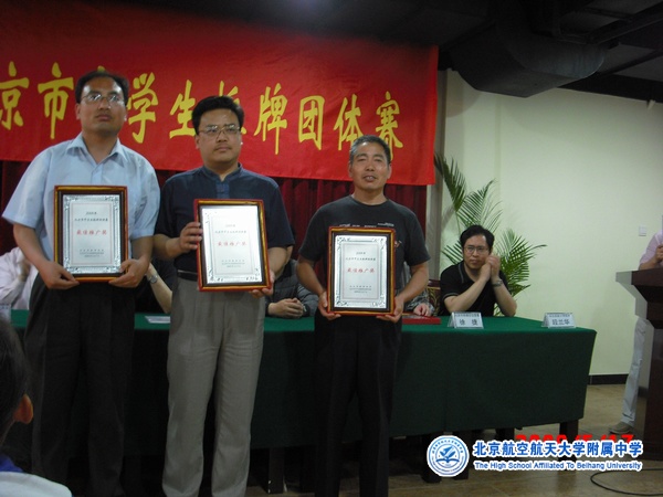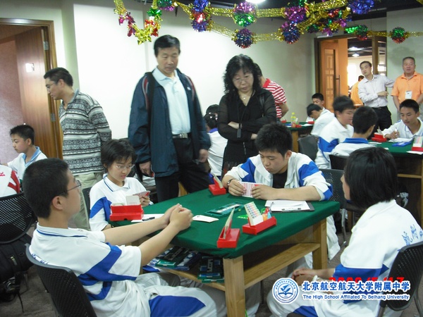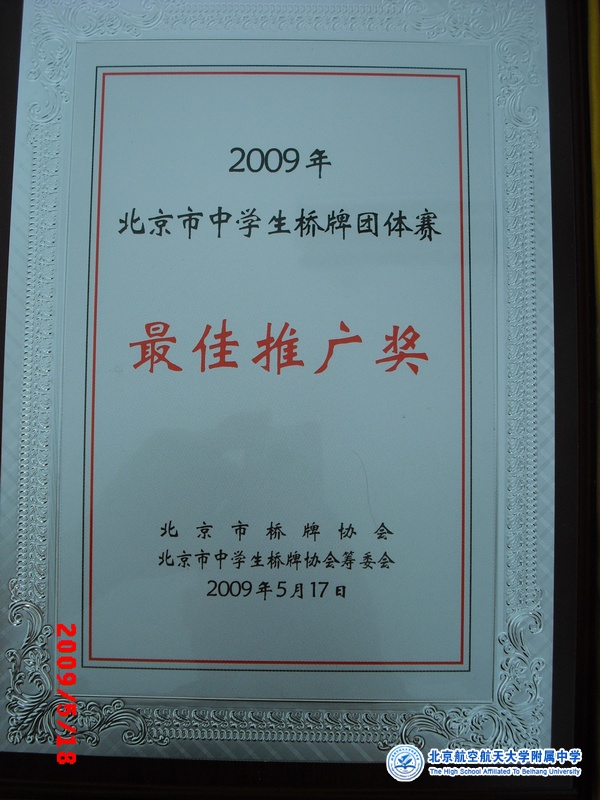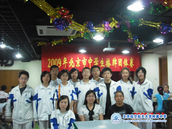 2009年北京市中学生首届桥牌团体赛于2009年5月17日在北京市桥牌协会活动中心举行。我校初中组在十八支参赛队伍中取得第13、15和16名;高中组在22支参赛队中获得第19名。