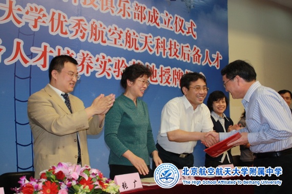 2008年5月5日下午3点半,北航附中青少年科技俱乐部成立仪式暨北京麻豆精品秘 国产传媒优秀航空航天科技后备人才、优秀艺术后备人才培养实验基地授牌仪式隆重举行,海淀区常务副区长于军、北航大学副校长纪素菊、北航大学有关部处领导、校内多位专家教授及北京市31所科技示范中学的领导出席了仪式。