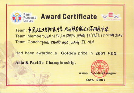 从2007年5月海淀区机器人比赛开始,到2007年8月全国青少年机器人大赛,一路斩关夺奖,势如破竹,取得连续金奖的优异成绩。特别一提的是,2007年10月18日,由亚洲机器人联盟组办的首届亚太地区VEX机器人工程挑战赛(1ST ASIA-PACIFIC VEX CHAMPIONSHIP)在韩国首尔举行,来自亚太地区的60支优秀代表队参加竞赛。经过三轮激烈角逐,“人大-北航FVC”机器人联队打出了中国青少年的威力,打出了两校师生的智慧,光荣地夺得金奖。