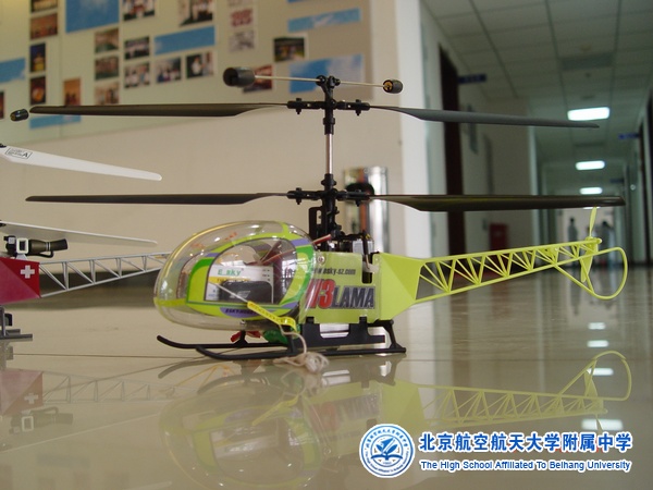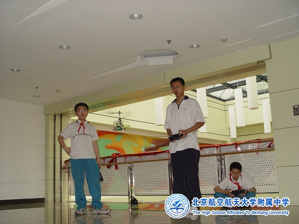 北航附中航模队的五位同学,在新落成的海淀区少年宫三层大厅里表演了微型无线电遥控直升机模型。只见机身只有30公分长的直升机模型在同学们通过无线电遥控设备的操作下,时而悬在空中纹丝不动,时而又自如的前进、侧飞、倒。精彩的飞行表演赢得了参观领导和学生代表的称赞。