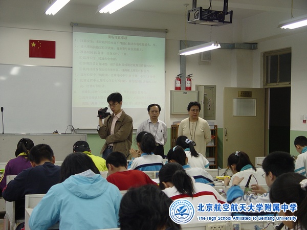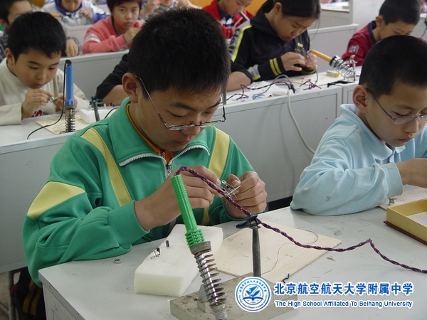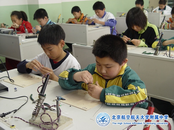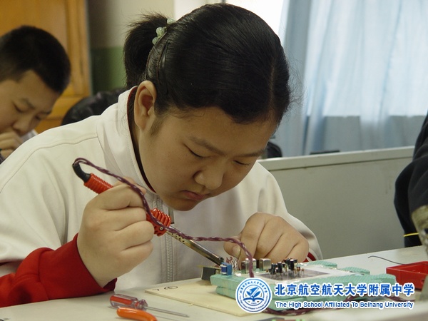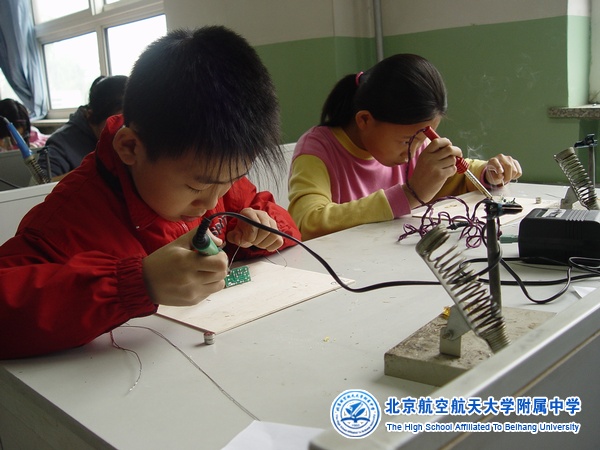 多年来,北航附中一直在初、高中年级开设以电子电子制作为内容的劳动技术课程,同学们在该课程中可以学到相关的电子技术知识,学会识别一些电子原件,掌握对电子原件进行测试的方法,并亲自动手完成10几项电子小制作。在2004年和2005年海淀区中小学电子技术竞赛中,北航附中均获得了初、高中团体第一名,并代表海淀区参加了北京市的比赛。