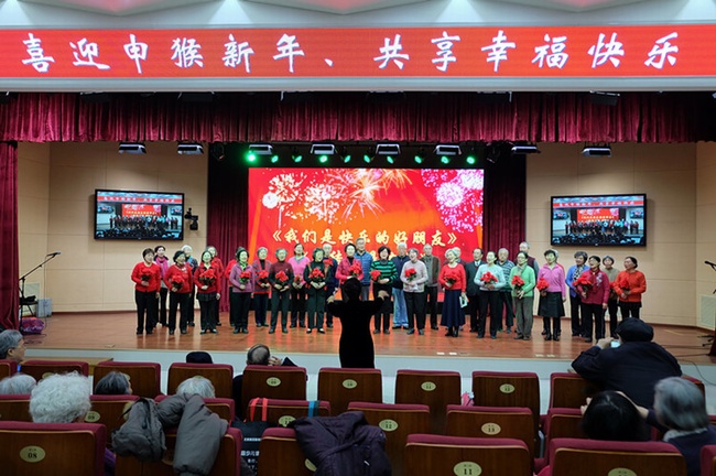 2015年12月29日上午北航实验学校中学部(北航附中)退休党支部组织全体退休老师,在学校阶梯教室举办“喜迎申猴新年 共享幸福快乐”的新年联欢活动。100多名退休老师喜气洋洋来参加活动,北航实验学校吴鹏程校长到会祝词,北航“三老教协”领导徐扬禾、周自强教授,北航离退休处宋青松副处长也到会祝贺。
