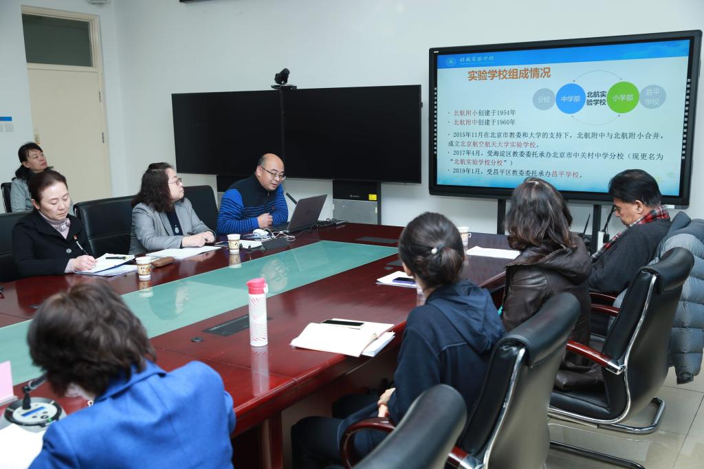 吴鹏程校长从实验学校基本情况、办学情况、办学特色、办学水平、存在问题等五个方面向曹书记进行了全面汇报,简要回顾了学校的发展历程、管理体系、师资队伍、硬件建设等情况,汇报了坚持党的全面领导、落实立德树人根本任务、师德师风建设、强化安全稳定工作等方面的举措,以及学校近几年在教师引进、学科发展、教学研究、大中小联动培养模式、航空航天科技特色、课程建设、人才培养成果、办学水平、国际交流、发挥优质学校辐射作用、中阳支教等方面取得的成绩,并就学校下一阶段的发展方向以及面临的主要困难与挑战向曹书记进行了汇报。小学部李兰瑛校长对昌平学校的情况作了介绍。幼儿园彭博园长汇报了幼儿园的建设与发展情况、教师队伍建设、取得的成绩等方面,也就面临的困难和问题向曹书记进行了汇报。