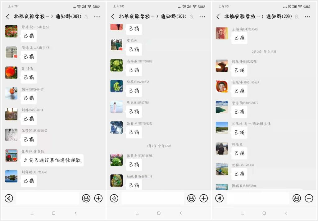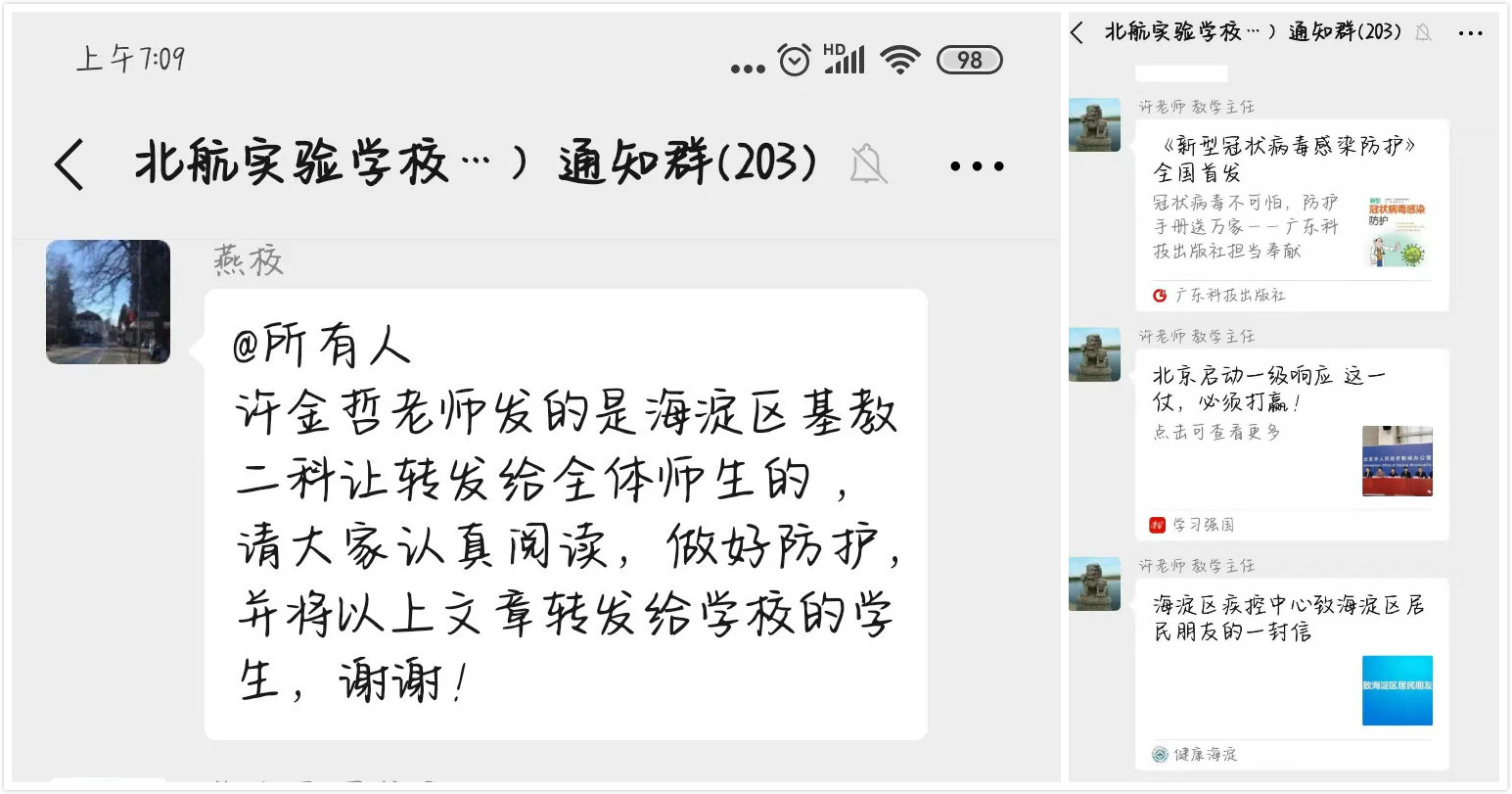 1月23日,北航大学对全体师生发出倡议书,中学部行政副校长燕晖老师第一时间将《新型冠状病毒感染防护》、《海淀区疾控中心致海淀区居民朋友的一封信》等有关疫情防控的各种官方文件转发到教师群,并号召全体师生不信谣不传谣,共同抗击疫情,理性面对疫情。