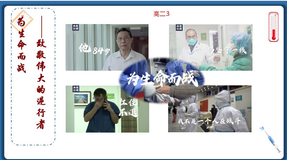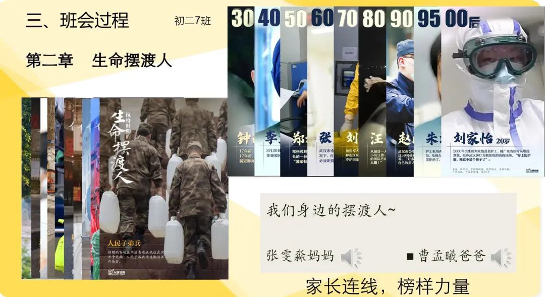 班主任在选材中利用新闻视频、在抗击疫情前线工作的家长的视频分享等多种形式,向同学们介绍一个个平凡又不平凡的抗疫英雄,引导学生通过分析、讨论,理解何为大爱,何为担当;如何做一个有责任感,甘于奉献,勇于担当的有为青年。
