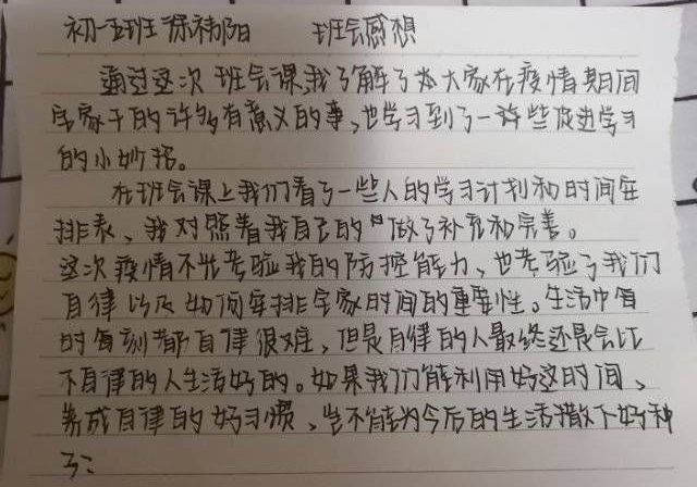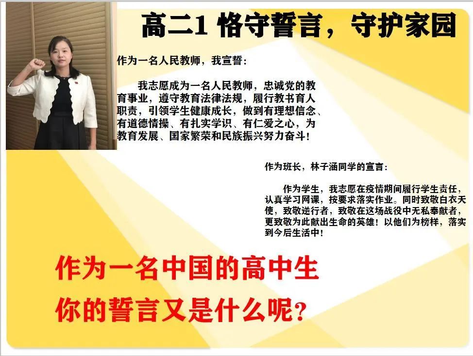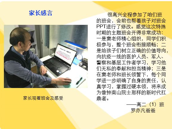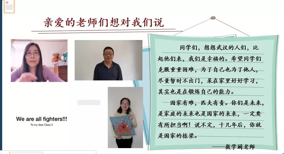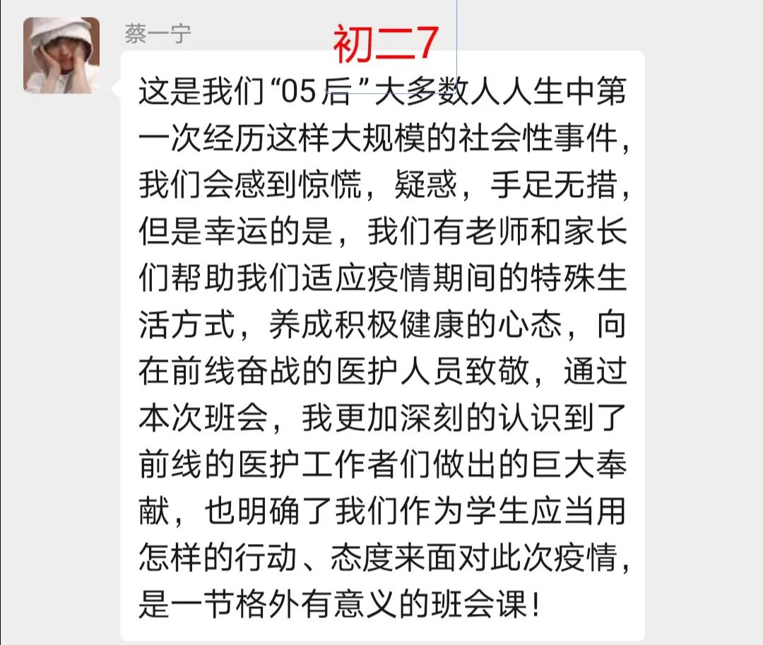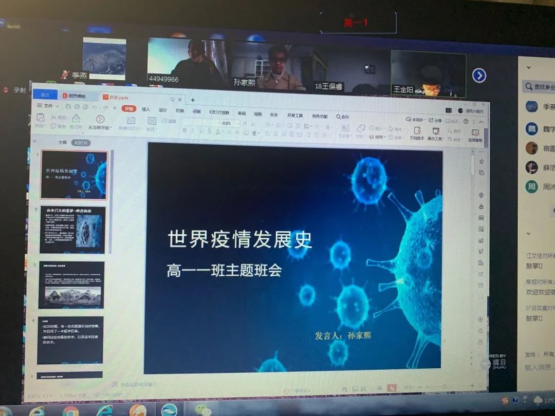 陶行知先生说“生活即教育”。这个特殊的假期对每个人而言都是一段不同寻常的人生经历,而反思自己应承担的责任和义务,科学规划居家自主学习生活,是现阶段老师最需要引领学生做的事情。班主任们利用“瞩目”、“腾讯会议”等多种网络视频会议软件,和学生、家长反复打磨,精心准备,网络班会陆续召开,别样的精彩呈现,一次次心灵触动,我们在屏幕前相聚,我们为抗疫共同努力!