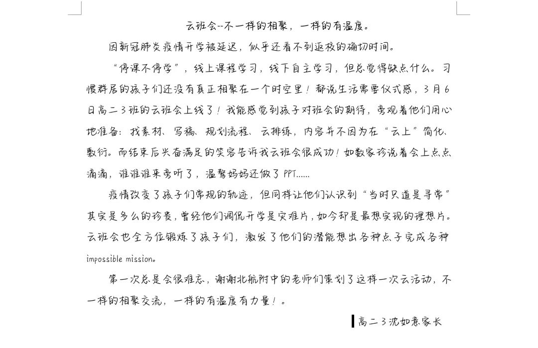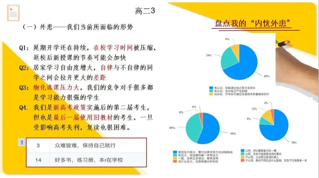 各班班会得到学生、家长广泛好评。班主任不愧是最了解学生的亲人,彷徨时刻,总有您坚定的目光,鼓励的言语,中肯、可行的建议。这一次“促膝交谈”,隔着屏幕已被您启迪,我们信心满满,干劲十足!向亲爱的班主任们比心!