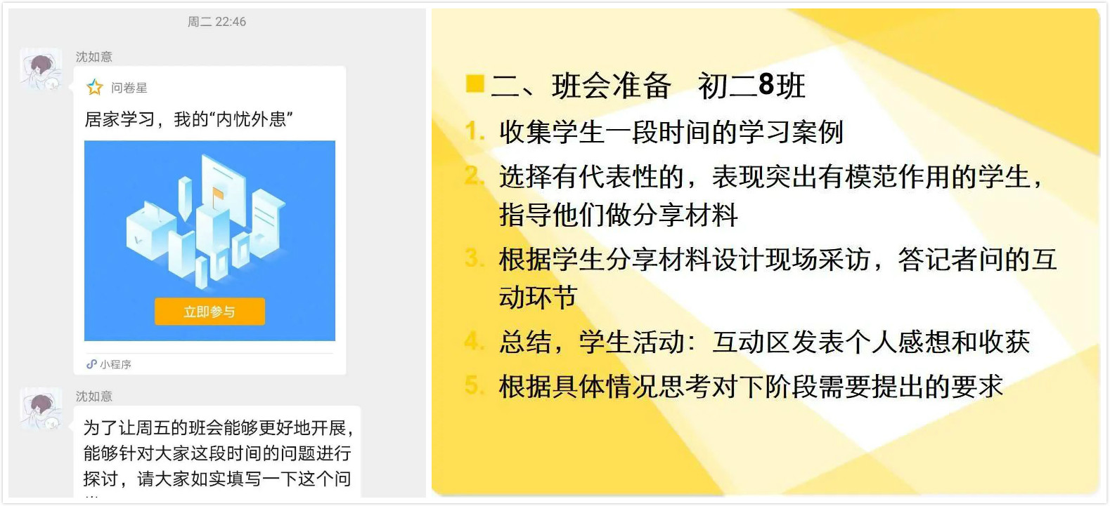 班会准备阶段,班主任老师通过精心设计调查问卷,前期电话采访等方式,精准确定班会目标,具体步骤,呈现方式等环节。反复打磨,确保班会的针对性、时效性!
