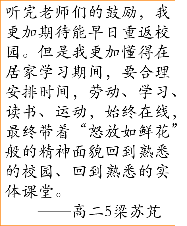 班主任通过前期调研,精选班级同学中高效安排居家生活的实例,请同学们在对比中反思自己如何高效利用时间,提高学习效率。各班的效率达人无私分享自己的秘籍,“番茄时钟”、“RAC时间管理技能"等干货让同学们眼前一亮。此外,同学还分享了在家自主学习期间进行体育锻炼、劳动、阅读、发展兴趣等方面的乐趣。
