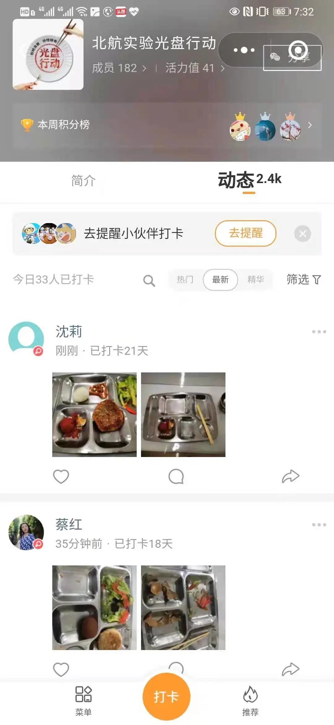 拒绝舌尖上的浪费,引领节俭新风尚。实验学校工会积极响应北航大学的号召,组织全体会员开展“光盘”打卡活动,用21天养成一个好习惯,让“珍惜粮食,尊重劳动”的好习惯伴随我们终身。