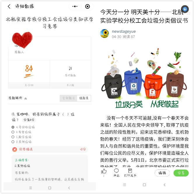 2020年5月1日起,北京市正式实施垃圾分类,实验学校校工会及时向会员发出倡议,组织会员及家属通过竞答方式认真学习垃圾分类知识,并积极行动起来。