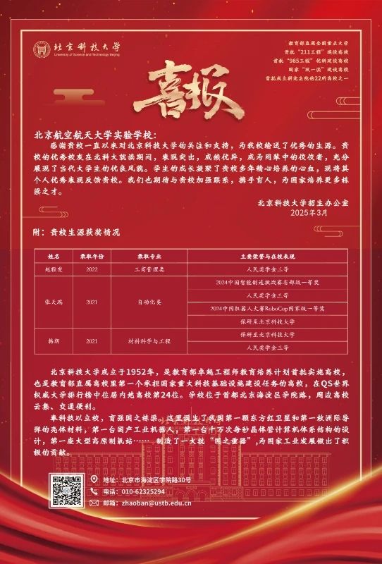 近年来,北航实验学校中学部始终努力践行新时代党的教育方针,不断探索“大学中学联动培养”的教育模式,培养了一大批具有创新精神和实践能力的优秀毕业生。