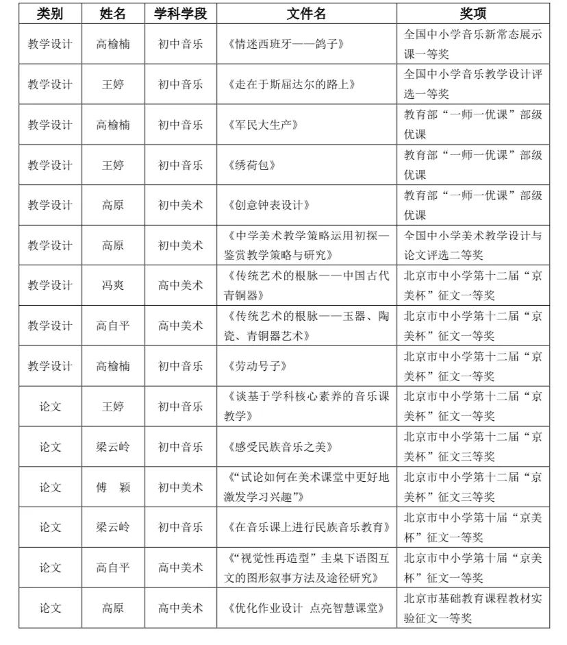 音美组老师积极参与市区级各类课题研究、培训活动,海淀区音、美教材教法辅导,多篇论文、教学设计获奖。