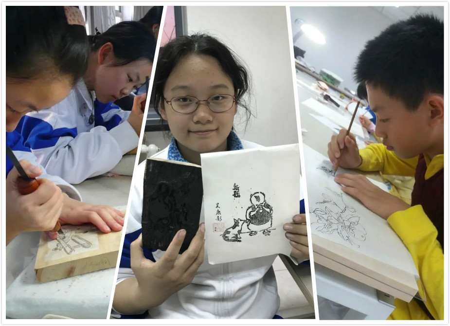 “十竹斋木版水印”体验馆:“十竹斋木版水印技艺”是国家级非物质遗产保护项目,被称为“印刷术的活化石”,这门课让古老的技艺走进现代中学生的生活。