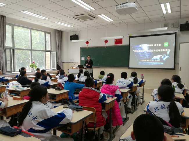 2016年11月9日和10日,海淀区人民检察院“法治进校园”全国巡讲团的王敬敬检察官走进北航实验学校中学部(北航附中)初一政治课堂,为同学们带来了精彩的法治教育课。