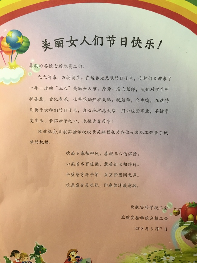 今天阳光明媚, 大地回暖,在这美好的一天,我们迎来了又一个 “三八”美丽女人节. 北航实验学校的全体女教职工们,每天在教育第一线用智慧点亮人生, 用女性特有的力量与魅力滋...